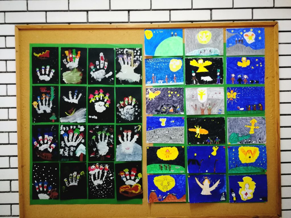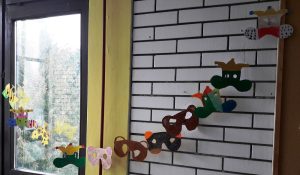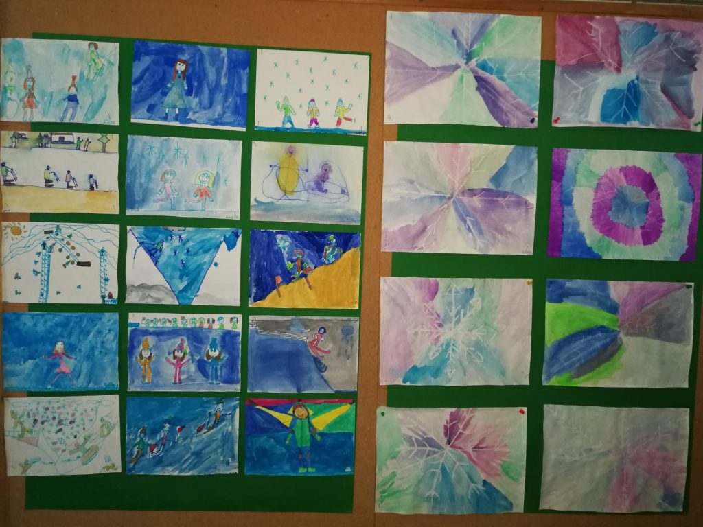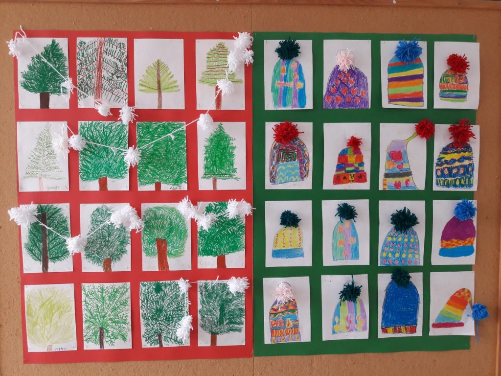 2.c se zaželio snijega pa je svojim naslikanim jelkicama izradio pahuljice od vune, a protiv hladnoće smo naslikali naše kape i izradili im „cofleke“.