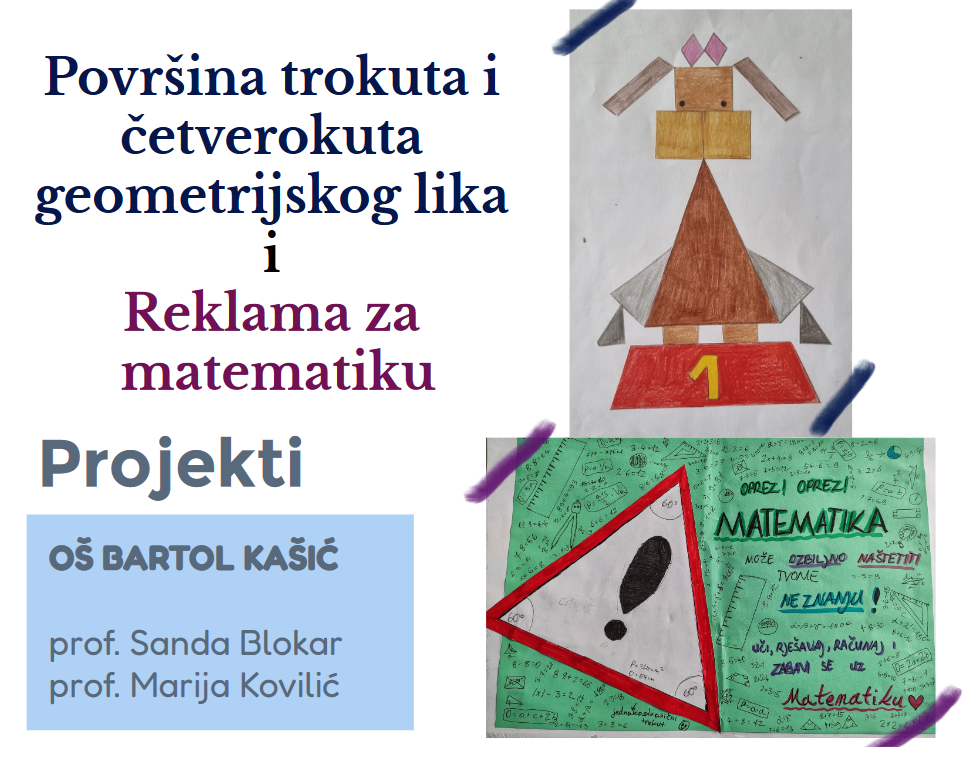 Učenici 6.a, 6.b., 6.c i 6.d razreda kroz projektne zadatke iz matematike pod nazivom “Površina trokuta i čtverokuta geometrijskog lika” i “Reklama za matematiku” izradili su autorske geometrijske likove. Sam projektni zadatak je obrade nastavne cjeline, prezentaciju svog modela objasnili su na koji način su izračunali površine i opseg svojeg geometrijskog lika koristeći naučeno. Učenici su iskazali svoju kreativnost, a stečena znanja su primjenjivali u svakodnevnom životu. Zadovoljeni su didaktički principi: zornosti, individualizacije, induktivno-deduktivan pristup i praktičane primjene.