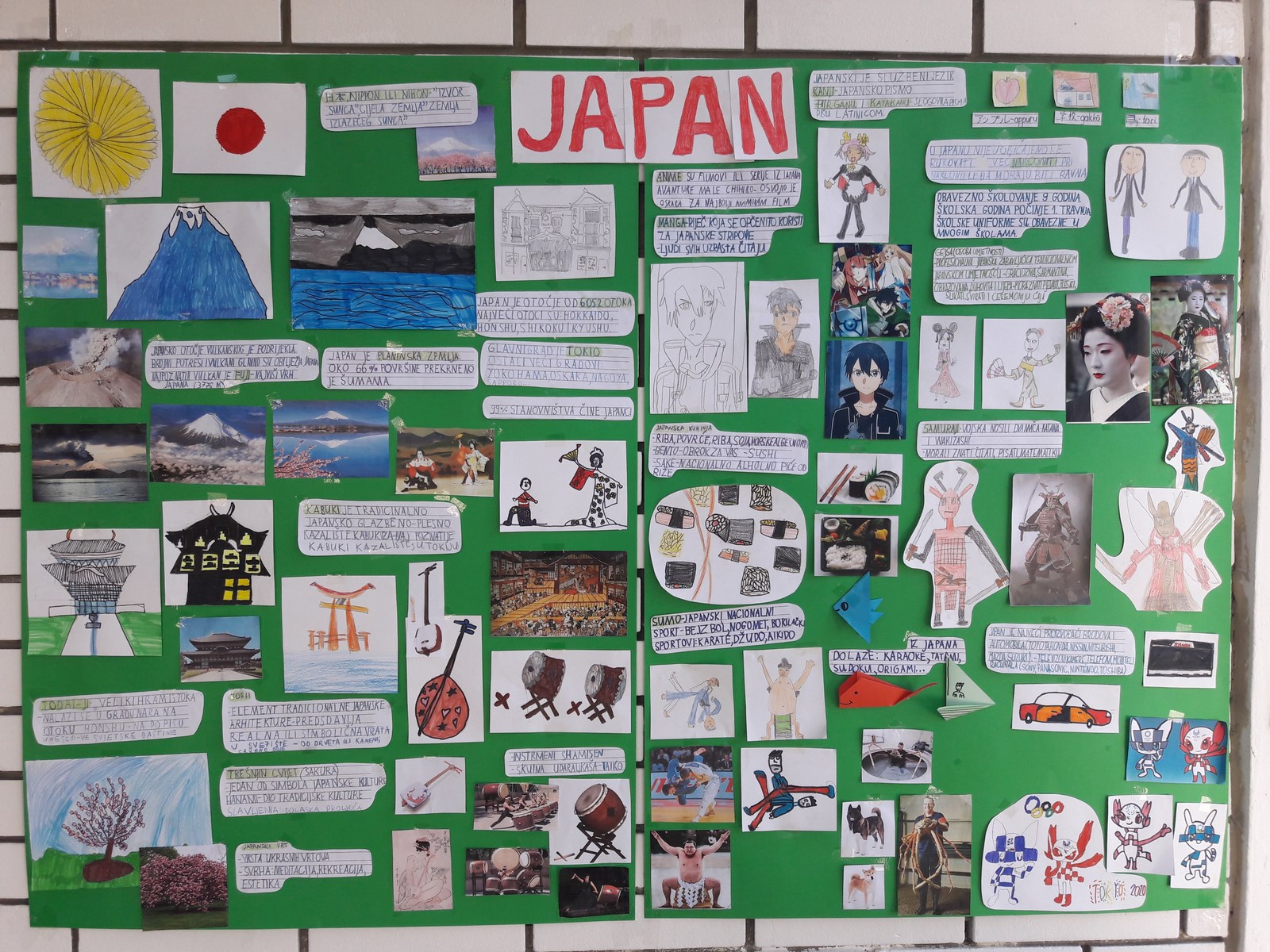 Budući da petina učenika 2.d trenira džudo, često u razredu izrađujemo životinjice origami tehnikom, a okušali smo se i u pisanju haiku pjesama, ove školske godine odlučili smo upoznati zemlju iz koje dolaze te zanimljivosti. Čitali smo, slušali, gledali, crtali i pisali o japanskom jeziku, školskim uniformama japanskih učenika, vulkanu Fujiju, japanskom kazalištu Kabukiju, japanskim filmovima i serijama (animama) te stripovima (mangama), samurajima, i o još mnogo toga. Sve naučeno prikazali smo na našem plakatu.